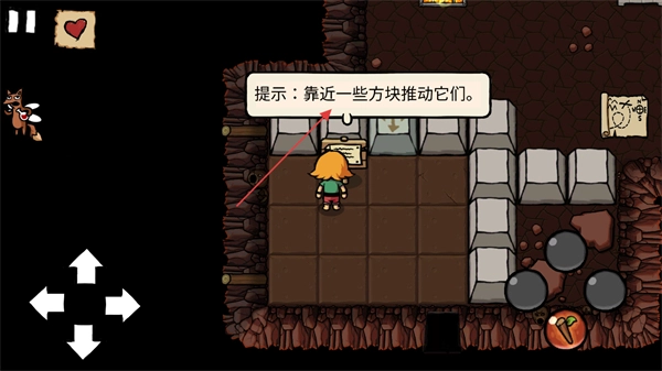 在游戏地图里进行探索时,你可以靠近告示牌来获取提示,这是游戏探索和解谜环节的基础操作之一,需要靠近方块并执行推动动作,才能推进游戏流程。