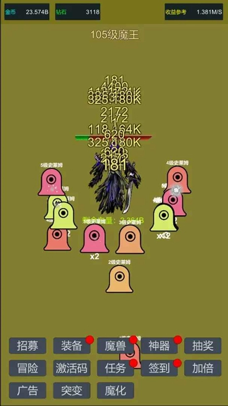 躺着就能变强:只需挂机就能自动获取金币,这些金币可以用来给史莱姆提升等级、完成进化,让它们从最初弱小不堪的“战五渣”,一步步成长为实力强悍的“史莱姆之王”。