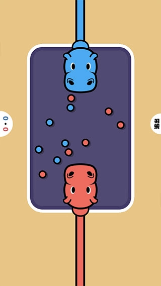 点击屏幕来控制河马吃掉小球,吃到和自己颜色相同的小球能获得2分,吃到对手颜色的小球则会扣除1分,率先达到80分的一方获胜!