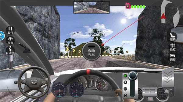 进入驾驶界面后,点击启动车辆,期间能借助方向盘或屏幕来操控车辆方向,该界面也具备视角调整的功能。