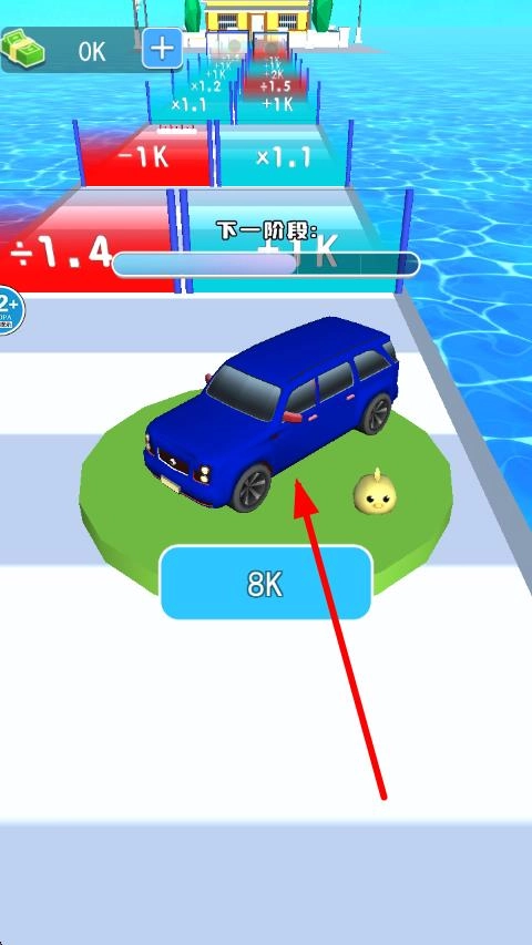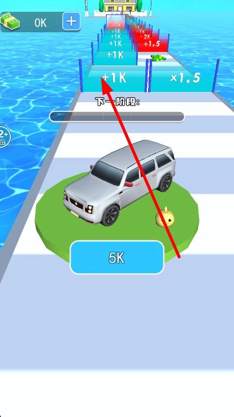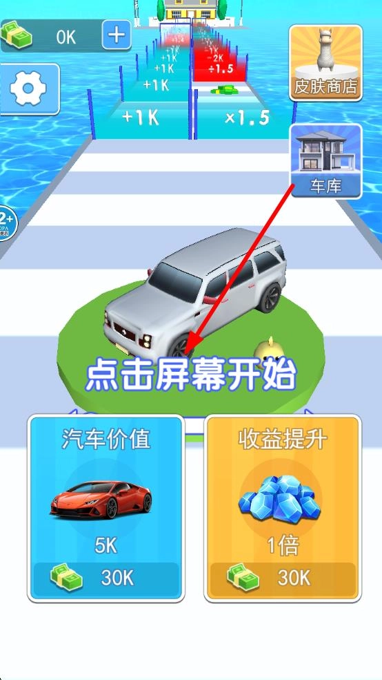 点击醒目的“点击屏幕开始”按钮,选定初始汽车型号后,仔细观察赛道上+1K、×1.5等增益标识的分布情况,再通过滑动屏幕灵活操控汽车,实现左右方向的精准移动。