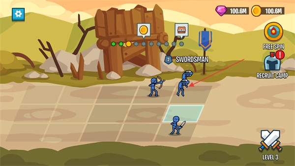你可以通过拖动士兵在格子里完成排兵布阵,等级相同的兵种之间能够相互合成。